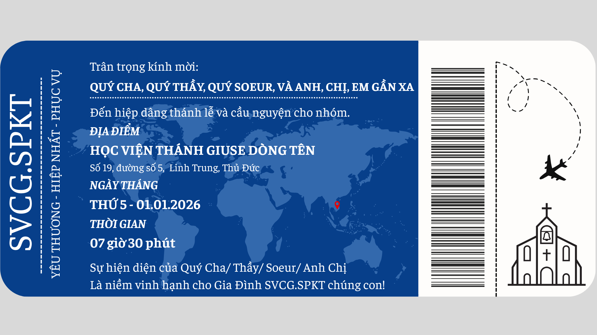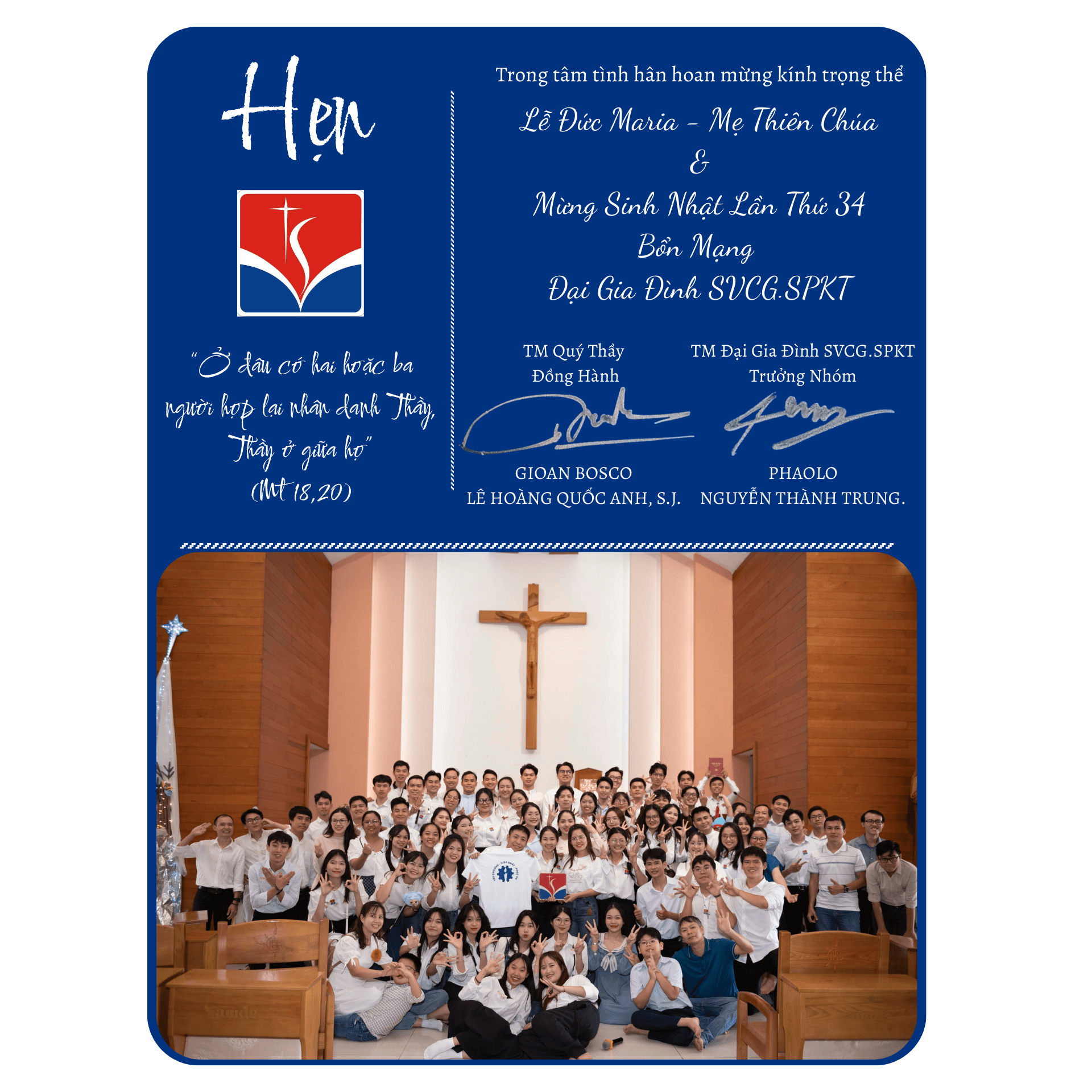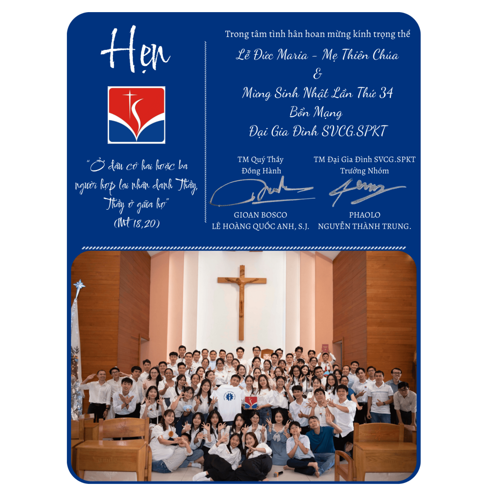 Trong niềm vui ngày đầu năm mới, hòa cùng Giáo Hội mừng kính trọng thể Đại lễ Đức Maria – Mẹ Thiên Chúa, Gia đình SVCG.SPKT chúng em mong muốn được đón tiếp Quý vị trong ngày Lễ Bổn Mạng & Kỷ Niệm Sinh Nhật Nhóm.